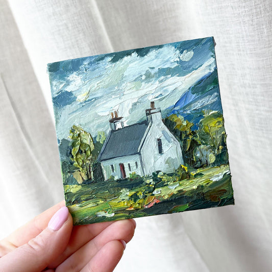 Scottish Cottage Oil Painting – Mini Landscape Original Art, 4x4 inch Impasto Textured Canvas, Countryside Wall Decor, Irish Cottage