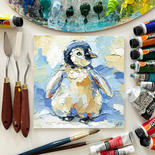 Christmas Original Oil Painting Baby Penguin – Impasto Arctic Animal Art, 8x8