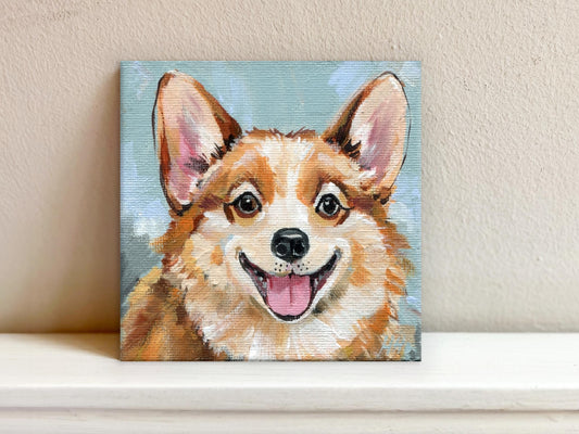 Happy Corgi. Cute Dog Painting. Acrylic Art, mini canvas 10x10 cm, Pet Lover Gift, Small Art, Original Hand-Painted Artwork. Pet Lover Gift