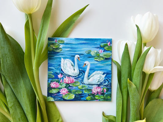 Swan Painting. Hand-Painted Mini Canvas, Romantic Lake, Water Lily Decor, Nature Lover Gift Landscape Artwork 4x4in, Gift, Original Artwork