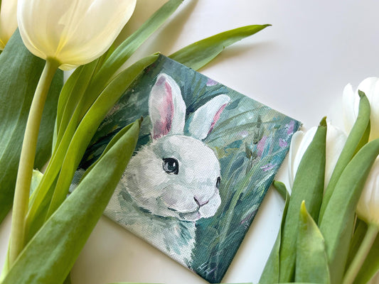 Rabbit Painting. Hand-Painted Mini Canvas, Woodland Bunny Art, Animal Decor, Nature Lover Gift Small Art for Home Decor, Fluffy White Bunny.