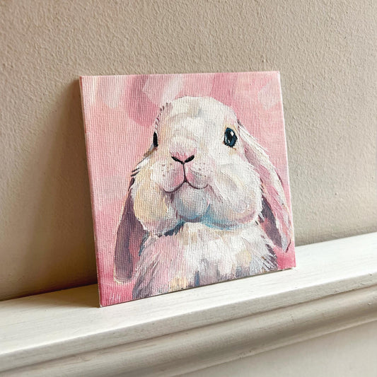 Cute Bunny Painting. Original Acrylic Mini Painting on Canvas, Adorable Animal on pink. Small Art for Home Decor, Fluffy White Bunny. Rabbit