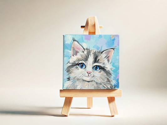 Cute Kitten Painting on blue Background. Mini canvas art 4x4 in, Pet Lover Gift Small Art, Original Hand-Painted Artwork, Cat with Blue Eyes