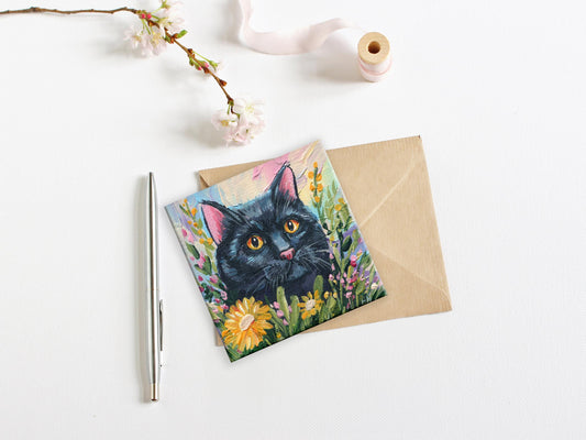 Cute Black Cat Mini Painting. Hand-Painted Black Cat Portrait, Cozy Home Decor, 4x4 In Canvas, summer Art, Cat in Flowers, Mother's Day gift