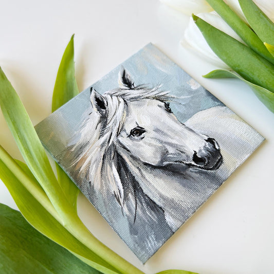 Horse Painting. Hand-Painted Mini Canvas 4x4in, White Horse Art, Equestrian Decor, Small Animal Artwork, Animal art, Original Artwork