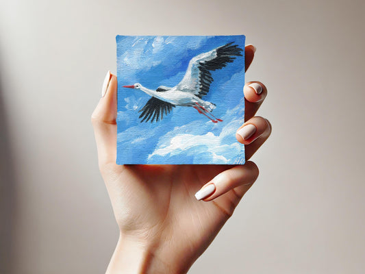 Stork Painting. Hand-Painted Mini Canvas, Flying Bird Art, Blue Sky Decor, Wildlife Nature Artwork Nature Artwork 4x4in, Original Artwork