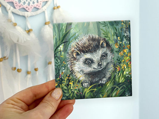 Hedgehog Painting. Hand-Painted Mini Canvas, Woodland Animal Art, Cute Forest Decor, Nature Lover Gift. 10x10 cm(4x4 in), Original Artwork