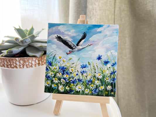 Stork flies over blooming field of daisies and cornflowers. Hand-Painted Mini Canvas Wildflower Meadow Art. Bird Lover Gift Original Artwork