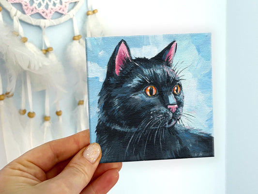 Cute Black Cat on blue Painting. Hand-Painted Black Cat Portrait, Cozy Home Decor, 4x4 Canvas, Cute Animal Art, Black kitten gift for girl