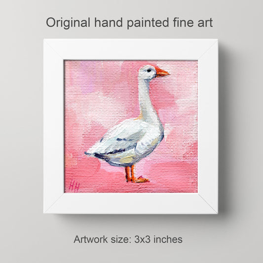 White Goose Mini Painting – 3x3 inch Hand Painted Farm Animal Art on Canvas, Small Bird Wall Decor, Whimsical Goose Gift, Pink cute gifts