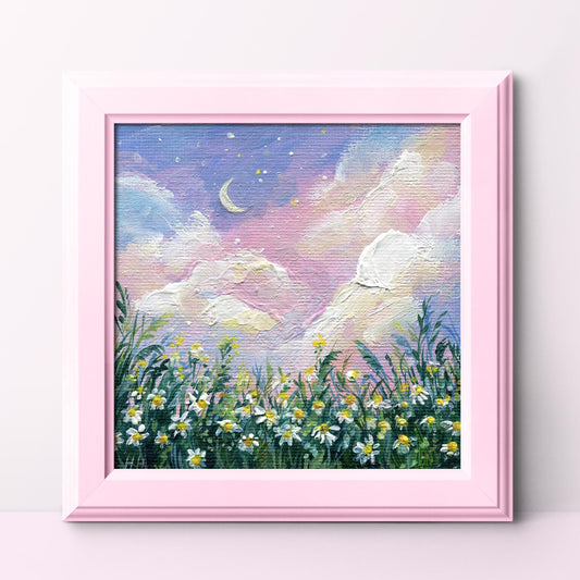 Field daisies Painting. Chamomile Painting. Wildflower Meadow. Original Small Nature Wall Art, Hand Painted Landscape, pink sunset Gift art