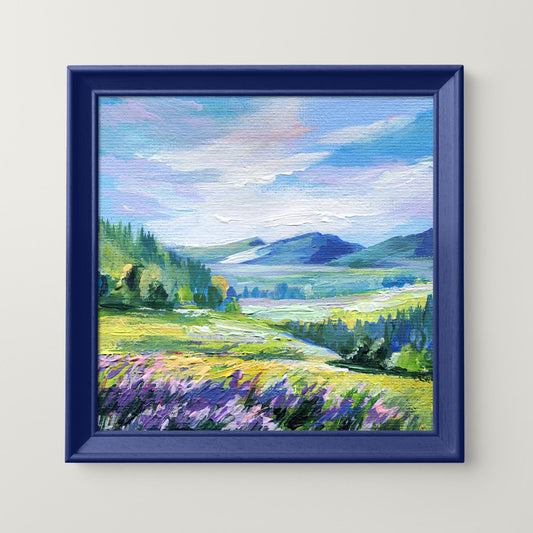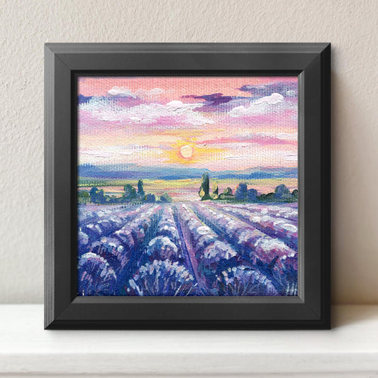Lavender Field Sunset Painting, Provence Landscape Mini Canvas, Original Art, Small Wall Decor 4x4, French Countryside Deco, Violet flowers
