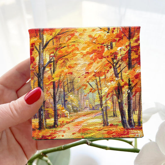 Autumn Forest Painting. Hand-Painted Fall Landscape Art, Colorful Tree Decor, Original Nature Artwork, Orange Frozen. Mini 4x4