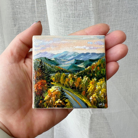 Blue Ridge Autumn Road – Original Landscape Painting on Canvas, 3x3 in Mountain Art, Smoky Mountains Fall Decor, Miniature Painting mini art