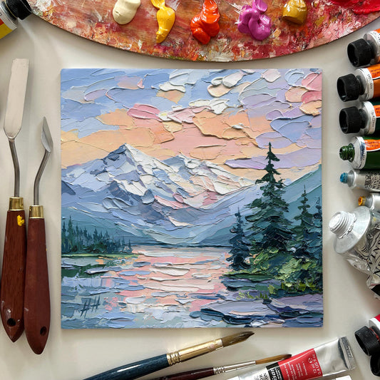 Mountain Landscape Original Painting, Alpine Nature Art, Hand-Painted mini Canvas, Snowy Peaks, Gift for Hiker, Moms. Home Wall Decor