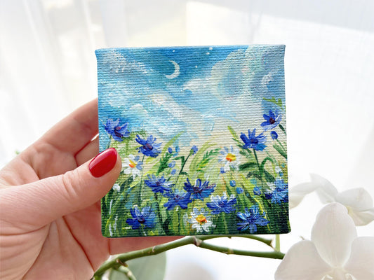 Mini Wildflower Meadow Painting – Cornflowers, Daisies and Crescent Moon – 3x3 Inch Hand Painted Acrylic Art, Summer Floral Gift oil artworkRegular price $45.00 USDRegular priceUnit price per-