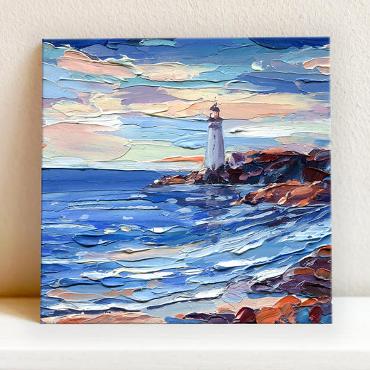 Lighthouse by the Sea – Original 6x6" Oil Painting, Coastal Impasto Seascape, Textured Sunset Ocean Art, Nautical Wall Decor Handmade GiftRegular price $99.00 USDRegular priceUnit price per-