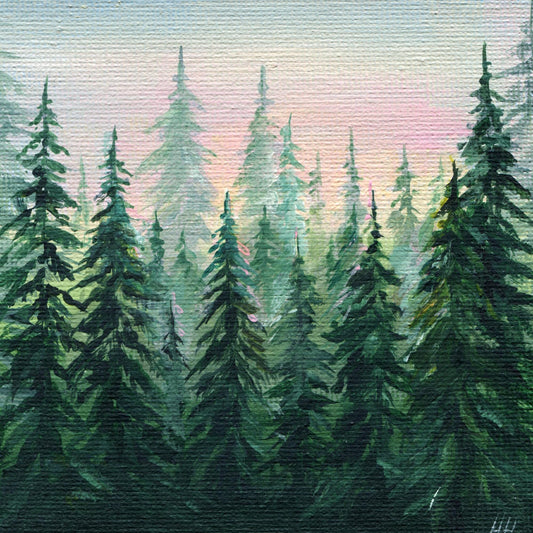 Forest Painting. Foggy forest, fogs in forest. Hand-Painted Mini Canvas, Pine Tree Landscape Art, Nature Decor Gift 4x4in Original Artwork