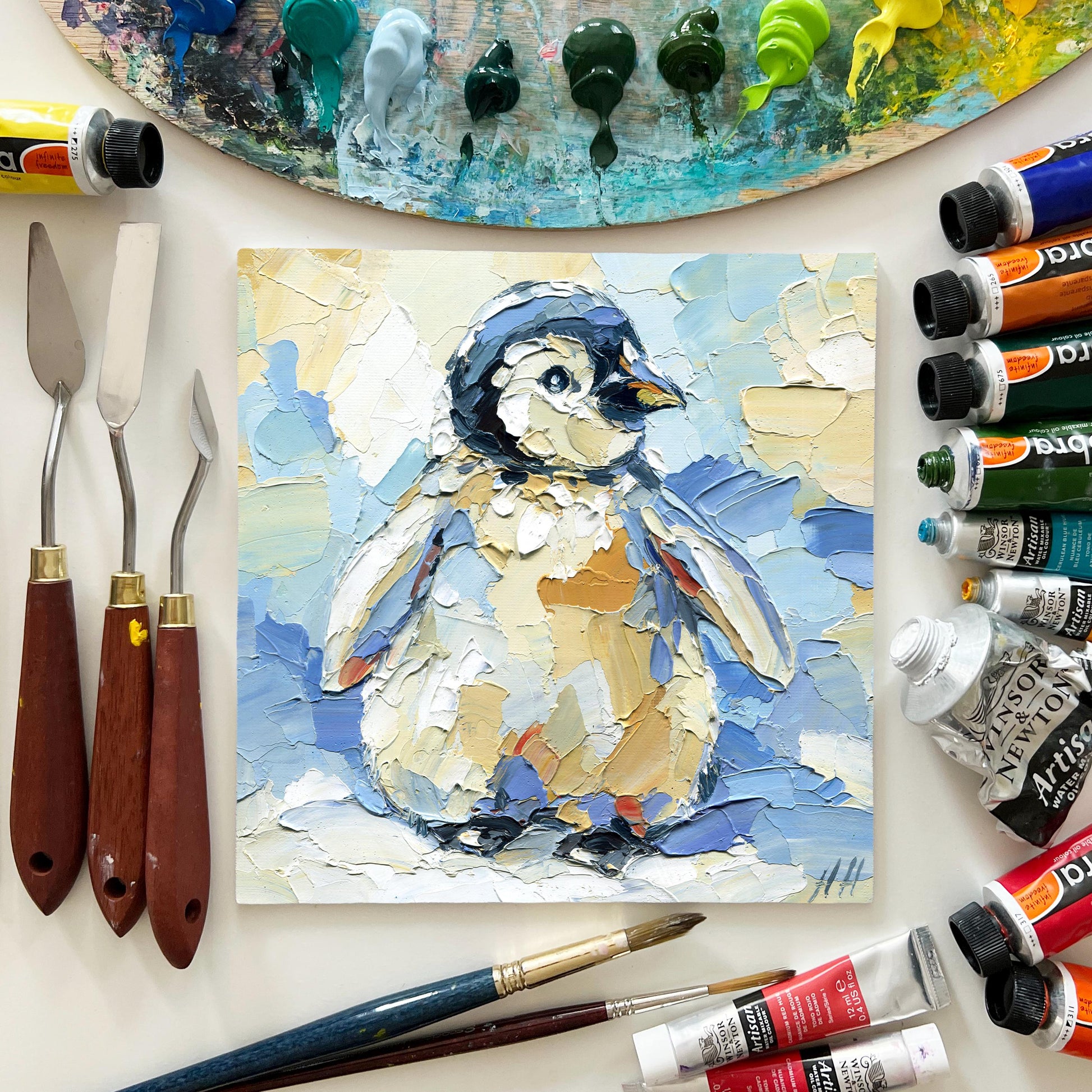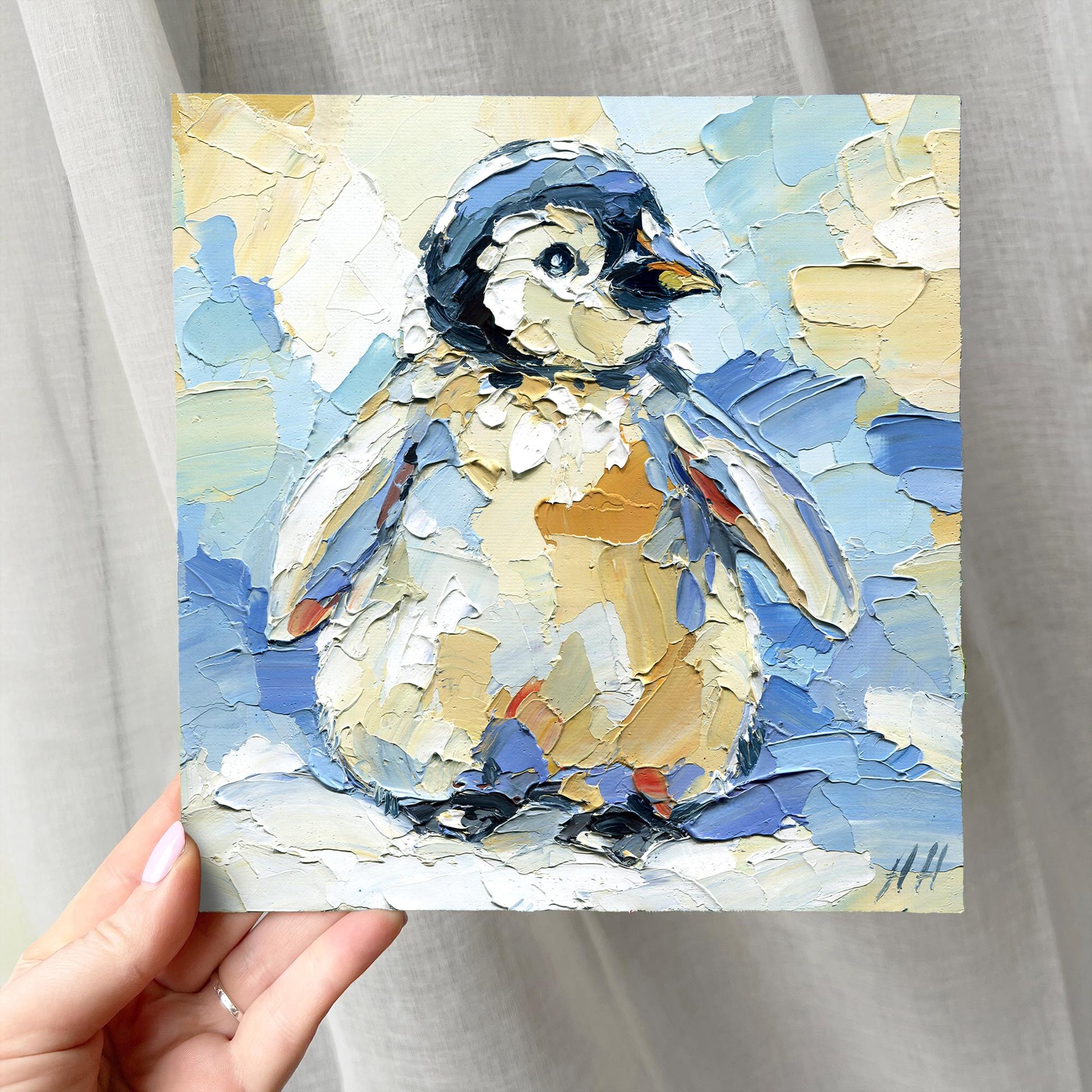Original 8x8 inch impasto oil painting of a baby penguin. Textured palette knife artwork with soft pastel tones — perfect for winter home decor or a sweet handmade gift.