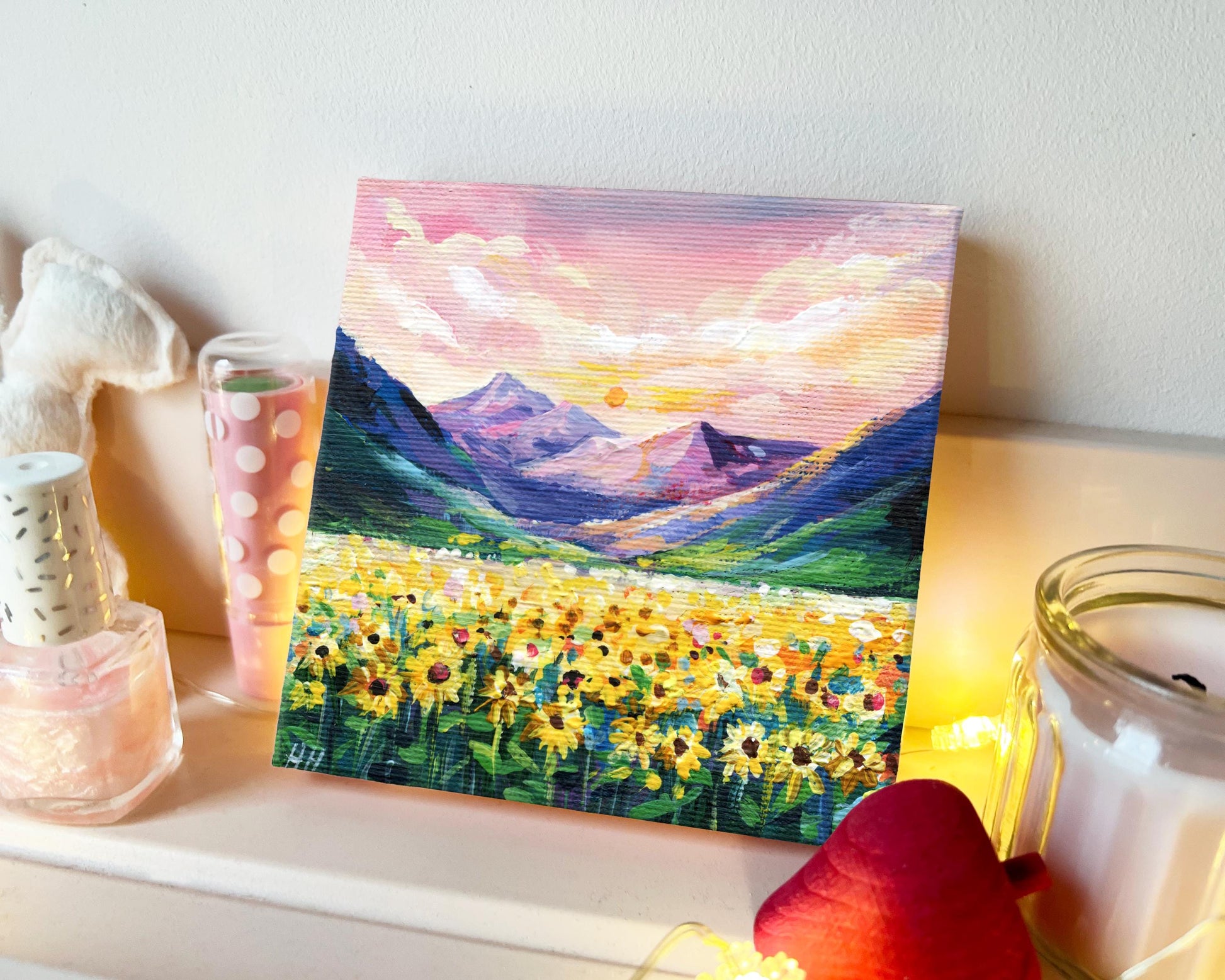 Original impasto acrylic painting featuring purple mountains and a bright yellow flower meadow under a pastel sky. This 4x4” mini artwork brings sunshine and serenity to any home — a perfect spring nature gift.