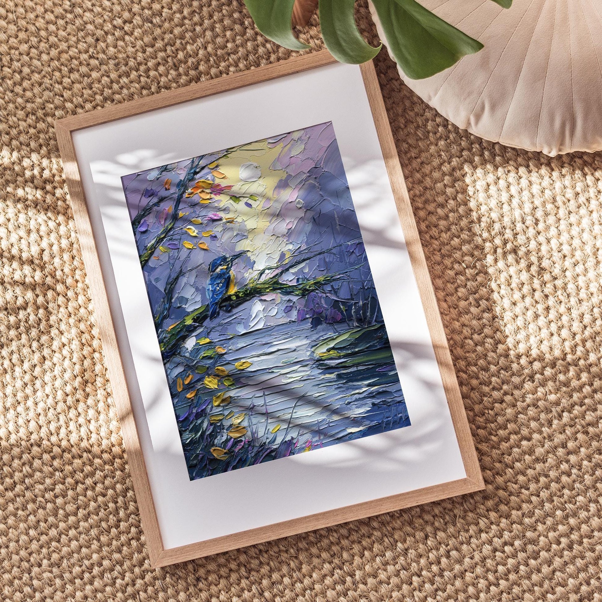 Kingfisher Oil Painting – Impasto Bird Art, Textured Lake Landscape