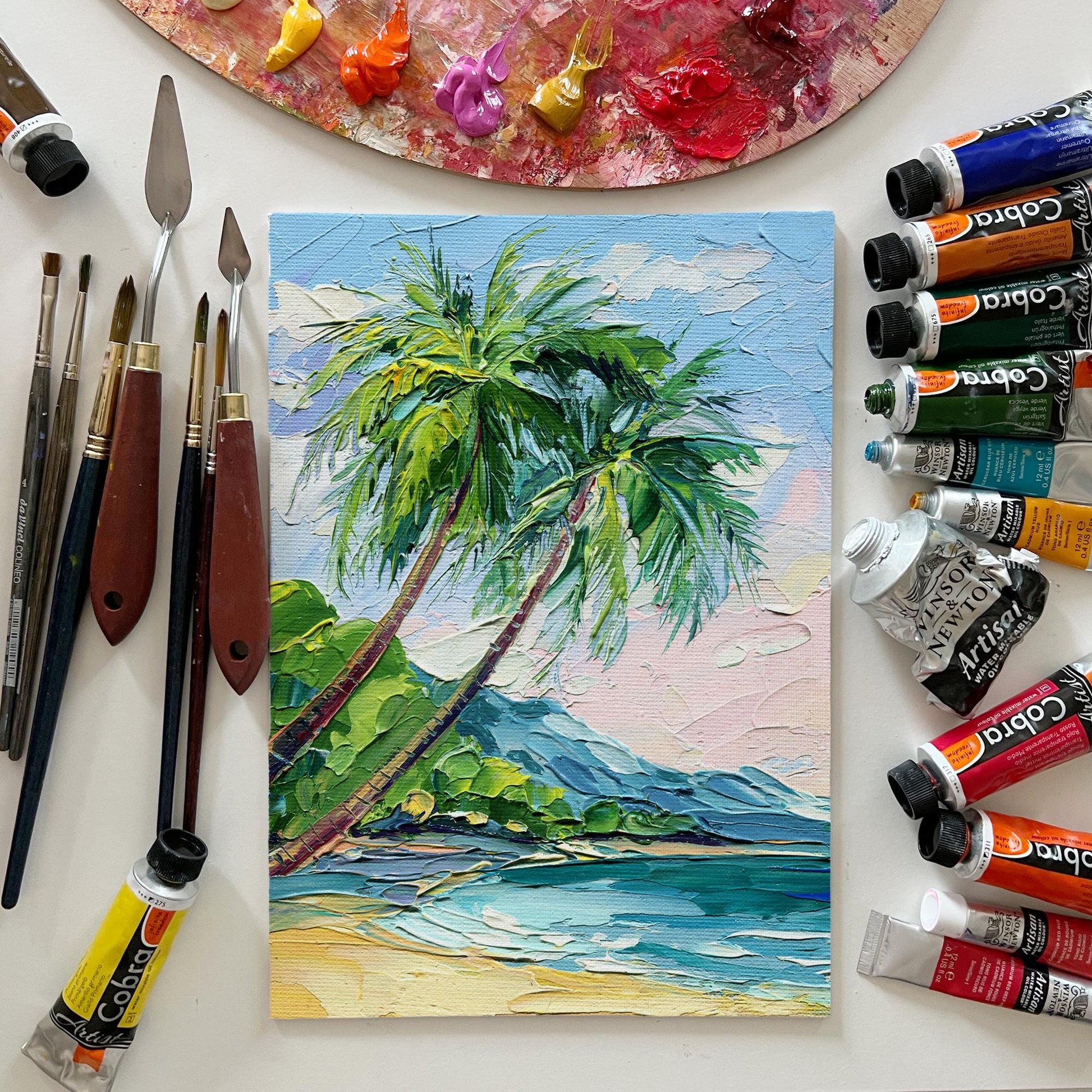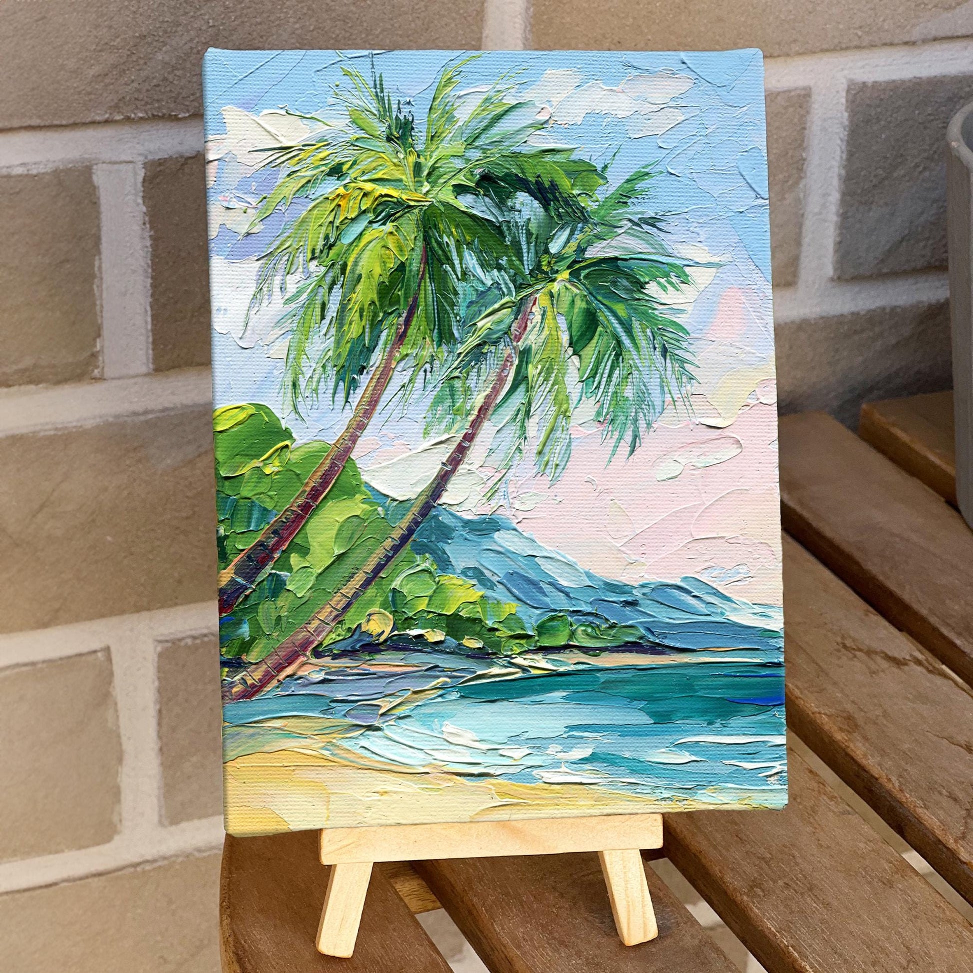 Original Maui Palm Tree Oil Painting: Impasto Tropical Seascape Art