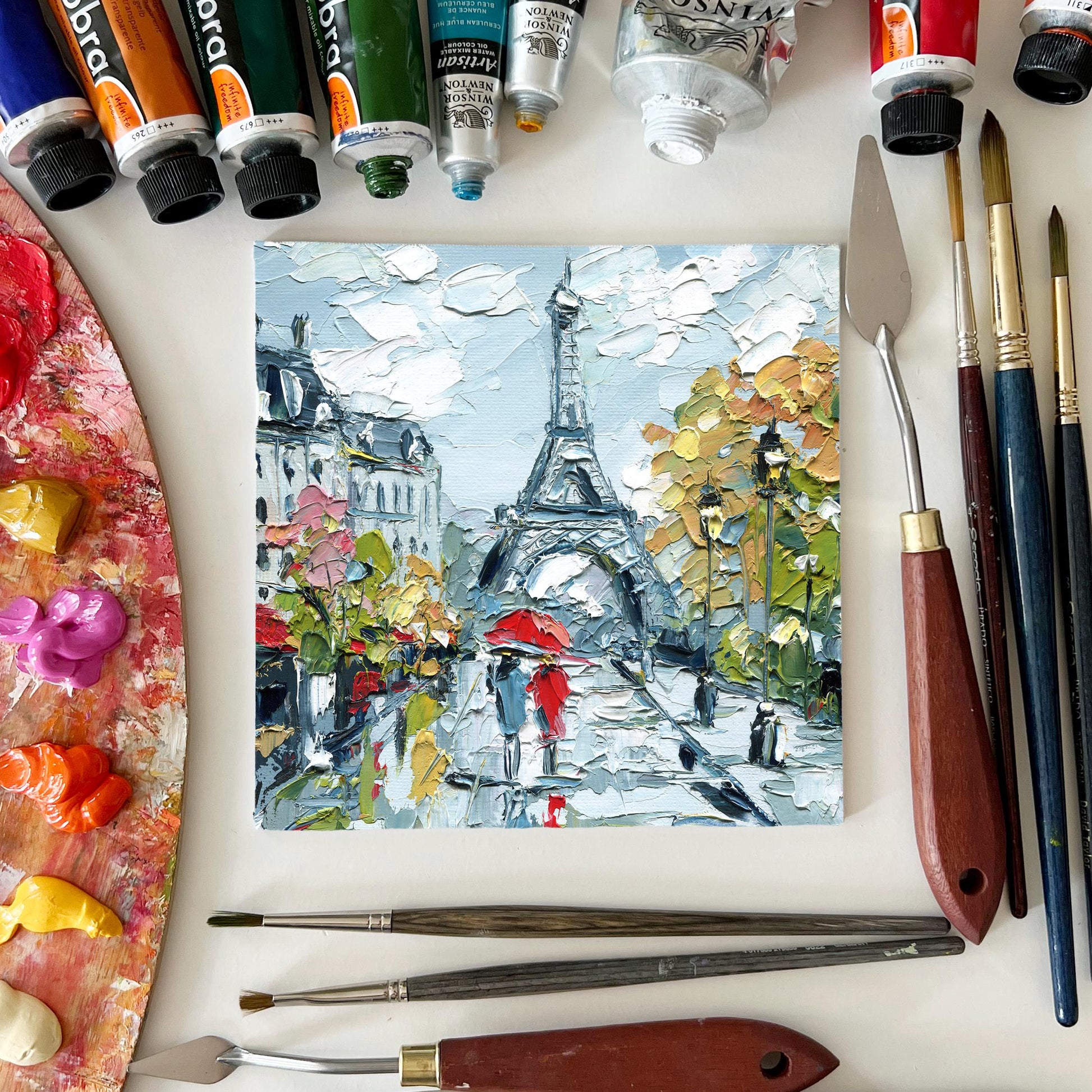 Bring the charm of Paris into your home with this small 6x6 original impasto oil painting featuring the iconic Eiffel Tower, romantic red umbrellas, and colorful autumn trees. This textured palette knife cityscape adds movement, depth, and a touch of European elegance to any room.